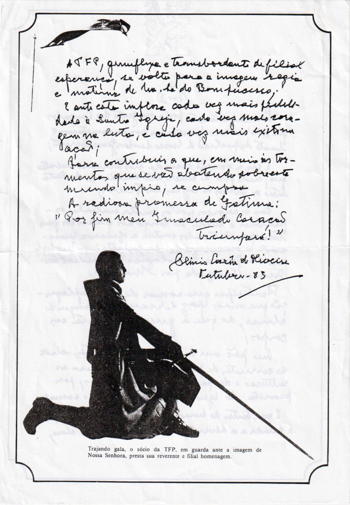 Com a admiração posta na gesta dos Cruzados que outrora reconquistaram aos maometanos o Santo Sepulcro de Nosso Senhor Jesus Cristo; E com a atenção cravada nos terríveis embates que, neste fim de século, vão decidindo a luta entre os filhos da luz e os das trevas; Com os esforços postos nestes embates espantosos e subtis ao longo dos quais aos fiéis toca opor obstáculos contra a ofensiva incessante e onímoda do misterioso Moloque que é a guerra psicológica mundial instrumentalizada por Moscou; Partícipes que somos desta conflagração que mais faz derramar sangue às almas do que a guerra cruenta aos corpos; Que põe em discórdia as nações, cinde as correntes de pensamento, dilacera as culturas e despedaça as famílias, para proveito do igualitarismo gnóstico e amoral; E que, dentro do homem, tantas vezes logra implantar a dúvida e a divisão, até o mais fundo da alma, A TFP, genuflexa e transbordante de filial esperança, se volta para a imagem régia e materna de Nossa Senhora do Bom Sucesso; E ante esta implora cada vez mais fidelidade à Santa Igreja, cada vez mais coragem na luta, e cada vez mais êxito na ação; Para contribuir a que, em meio às tormentas que se vão abatendo sobre este mundo ímpio, se cumpra A radiosa promessa de Fátima: “Por fim Meu Imaculado Coração triunfará!”