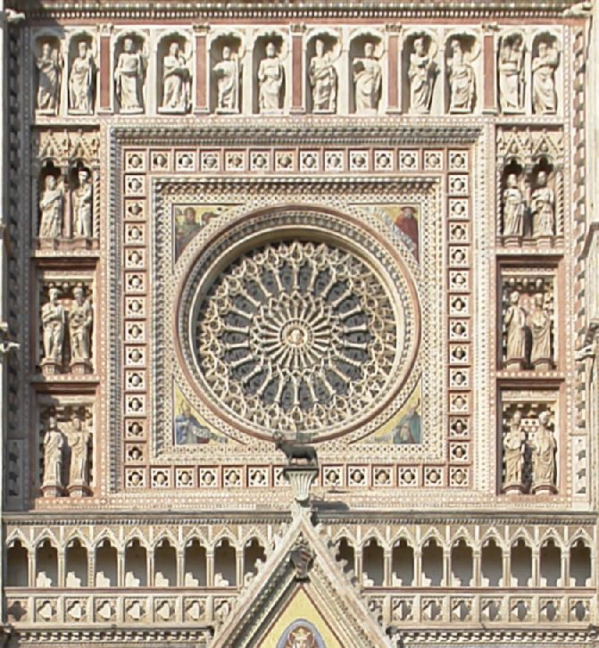 Fiquei um pouco em silêncio, porque quis que o impacto da primeira vista fosse bem notado pelos senhores. Os senhores estão vendo uma feeria de cores sobre uma fachada estritamente gótica. Não há aí o que não seja gótico e inclusive a rosácea. Esta última fica dentro de um quadrado, o qual quadrado não se diria bem exatamente gótico, tem qualquer coisa de clássico, mas que se encaixa tão perfeitamente ali dentro, que não se tem o que dizer. A cor escolhida é a mais esplendorosa das cores: ouro. Toda a fachada é sobre fundo dourado. É um mosaico de tal qualidade, tão rutilante, tão magnífico, que tendo esta igreja vários séculos, ela dá a impressão de terminada ontem. E, neste sentido, ela não apresenta a poesia do granito, que fica mais belo à medida que envelhece. O velho granito que desafia a todos os tempos e todas as intempéries, tem sua beleza. Aqui, dir-se-ia que foi feito no ano passado e que só conheceu verões ou primaveras. A igreja está novinha como se fosse de ontem. E os invernos e as tragédias da História escorregaram sobre ela sem a atingir em nada. Ela está magnífica, esplendorosa, sem alteração. O granito fala da eternidade na medida em que ele resiste ao tempo e afirma a sua existência contra este. Passa o tempo, o granito fica. O mosaico de Orvieto se reporta à eternidade no sentido de que ignora o tempo. Não lhe resiste porque não tem nada que ver com ele... que não a atinge. O mosaico está lá, a Catedral está lá.