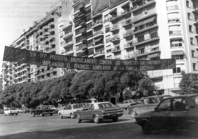 Comienza una gran batalla en defensa de la familia Abril - Estando en curso en el Congreso Nacional dieciséis proyectos de ley que introducen modificaciones drásticas y de fondo en la legislación familiar vigente —inclusive el divorcio— la TFP inicia una gran campaña en defensa de la indisolubilidad del vínculo matrimonial y de la familia. En este mes la entidad coloca pancartas en lugares estratégicos de Buenos Aires y frente a su sede principal, situada en una de las avenidas de mayor movimiento en la ciudad, con la siguiente leyenda: ''La TFP rechaza el divorcio y apoya a la família cristiana; la TFP protesta energicamente contra los proyectos que pretenden implantar el divorcio, demoledor de la familia cristiana".