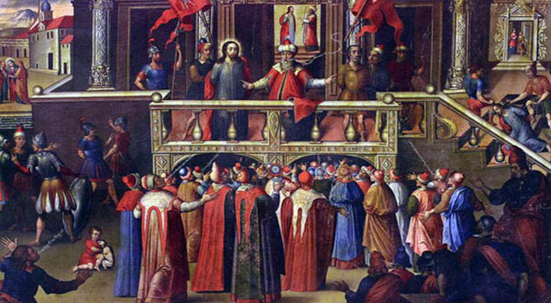 “Acostumbraba el presidente conceder por razón de la fiesta de la Pascua la libertad de un reo, á elección del pueblo; y teniendo a la sazón en la cárcel á uno muy famoso, llamado Barrabás, preguntó Pilato a los que hablan concurrido: