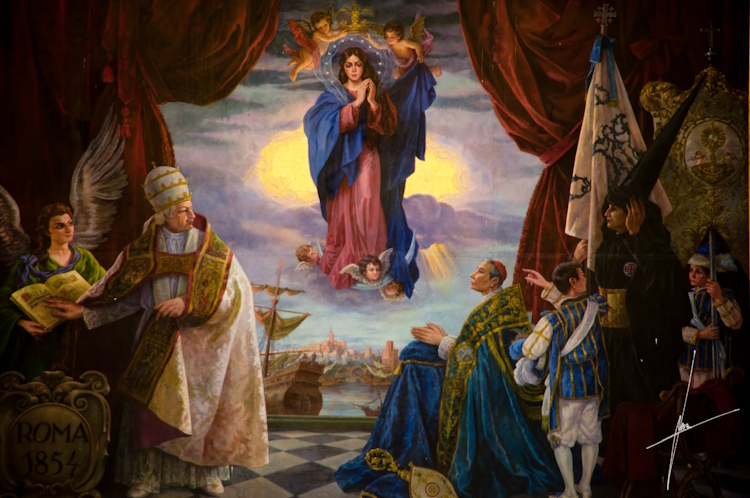 Catedral de Sevilla – Crucero – Representación de la firma del Dogma de la Inmacuclada Concepción por el Beato Pío IX el 8 de diciembre de 1854, obra de Alfonso Grosso, donde se ve la Virgen Inmaculada con la cara de la Macarena, el Papa Pío IX, el Cardenal de Sevilla, un Seise y un nazareno de la Hermandad del Silencio, la primera en aplicarlo.
