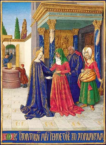 La Visitación, Jean Fouquet, c. 1452-1461, pintura del Libro de Horas de Étienne Chevalier, Chantilly, Museo Condé.