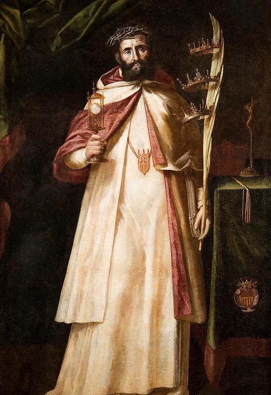 En la cabeza porta la corona de espinas que recibió de Cristo, y la boca está cerrada con un candado, que le pusieron los musulmanes durante su presidio en Argel para silenciarle en sus predicaciones. Con la mano izquierda sostiene la palma del martirio, con las tres coronas de castidad, elocuencia y martirio, y con la derecha una pequeña custodia, que hace referencia a la Eucaristía que le llevó un ángel antes de morir.