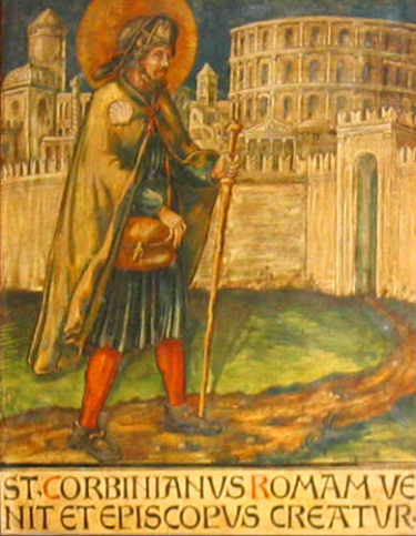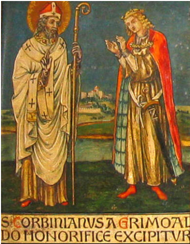 “El papa lo despidió, lleno de admiración por su humildad, y convocó un concilio, en el que se decidió por unanimidad que Corbiniano debía regresar a su sede. El papa mandó llamar al santo hombre, quien, incapaz de resistir a los argumentos de los asistentes y a la autoridad de Gregorio II, se retiró muy triste de Roma y regresó a Baviera. Fue detenido por los guardias que el duque Grimoaldo había apostado en la frontera con órdenes de no dejarlo pasar sin que prometiera visitar al duque. Sin embargo, al llegar ante el palacio, el santo hombre mandó decir a Grimoaldo que solo lo vería si dejaba a Piltrude, viuda de su hermano Teobaldo, con quien se había casado. Y como el príncipe no obedeció, perseveró en su negativa, acosándolo sin cesar con sus recriminaciones para llevarlo a la penitencia. Al cabo de cuarenta días, Grimoaldo y Piltrude prometieron separarse, y el santo obispo los mandó llamar a su presencia. Se postraron y, besándole los pies, confesaron que habían pecado gravemente. San Corbiniano puso las manos sobre sus cabezas, trazó en ellas la señal de la cruz y les impuso como penitencia limosnas, ayunos y oraciones. A continuación, entró en el palacio y se sentó con ellos a la mesa”.